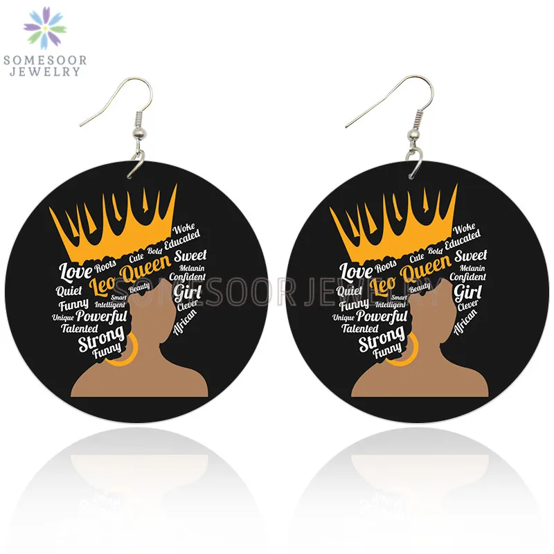 SOMESOOR I AM Leo Queen Stylish Wooden Drop Earrings Soulful Courageous Melanin Sayings Printed Dangle Jewelry For Women Gifts